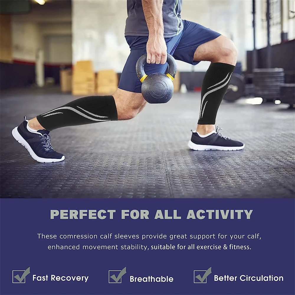 These calf compression sleeves are designed to provide targeted support and improve circulation in the lower legs. They help reduce discomfort from shin splints, muscle fatigue, and swelling. The compression design promotes better blood flow for enhanced recovery and performance. Made from breathable and stretchable fabric, they ensure a comfortable and secure fit. Ideal for running, workouts, or long periods of standing, they offer versatile use. The footless design allows for flexibility and easy pairing with any footwear. Lightweight material makes them suitable for all-day wear without irritation. Durable construction ensures long-lasting performance even with regular use. Easy to put on and remove, they add convenience to your routine. These sleeves are a practical solution for improving leg comfort, support, and recovery.