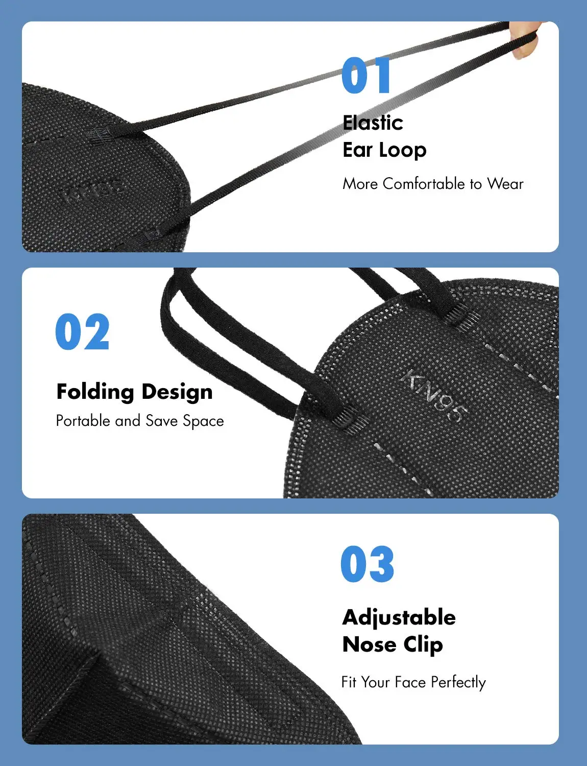 These KN95 face masks are designed to provide reliable protection with high filtration efficiency. The 5-ply construction helps filter out particles and airborne contaminants. Each mask is individually wrapped for hygiene and convenience. The breathable design ensures comfortable wear for extended periods. Soft ear loops provide a secure fit without causing discomfort. The lightweight structure allows for easy daily use in various environments. Ideal for travel, work, and public spaces, they offer versatile protection. The snug fit helps reduce air leakage for better performance. Durable materials ensure consistent quality across each mask. This pack of masks is a practical solution for maintaining everyday safety and protection.